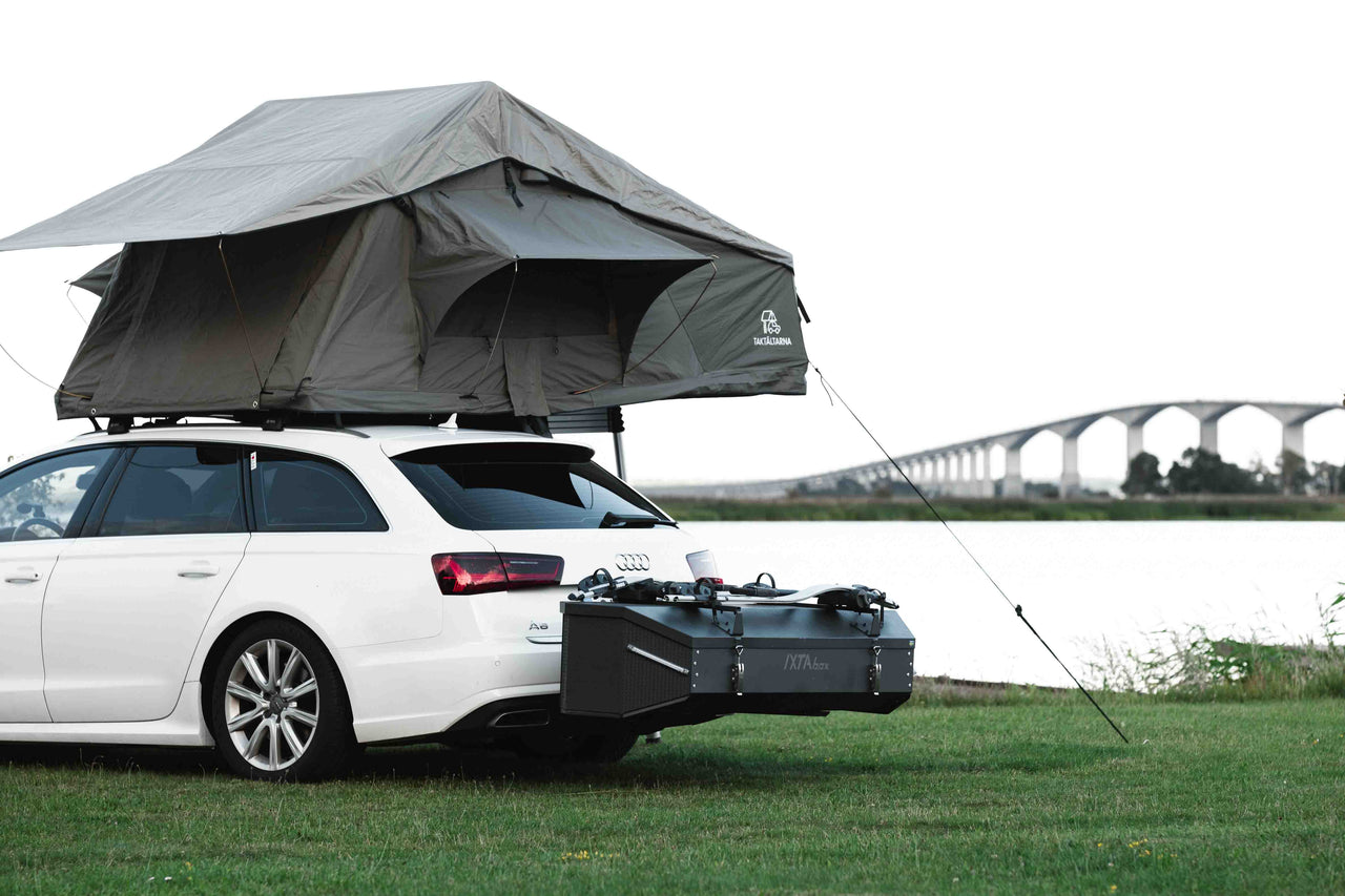The IXTAbox, mounted behind the car, provides superior aerodynamics compared to a roof box. Its new design features a sloped rear section and bottom-front wings, minimizing turbulence between the vehicle and the box. These enhancements result in a streamlined profile that reduces wind drag for both the car and the IXTAbox.