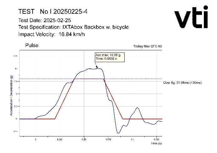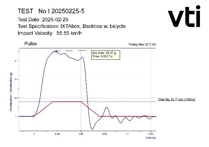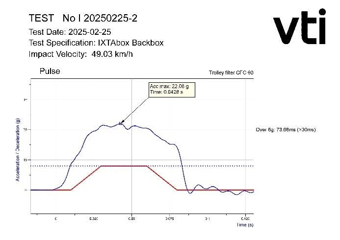 Now testing with the "Plus pulse", a harsher crash used for child car seats to receive a “plus” certification. While these standards aren’t directly applicable to cargo boxes, the high stress is useful for consumer-level validation. It should be emphasised here that it is also about getting low values for the load in the child crash dummy that is used. Therefore, it is not possible to directly translate the extensive requirements for a child car seat into requirements for a load box.