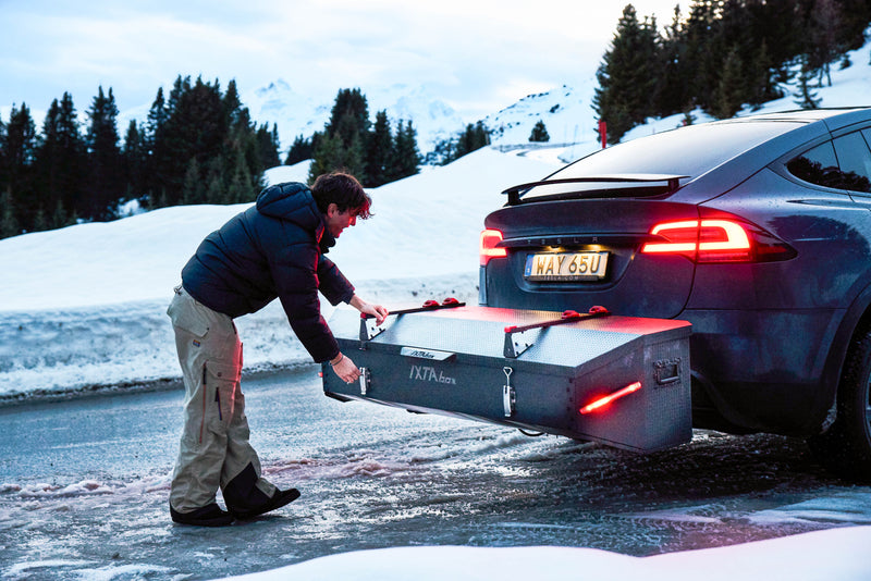 Because it sits behind the car instead of on the roof, IXTAbox Pro creates less aerodynamic drag than a traditional roof box. This can help reduce fuel consumption and preserve electric range compared to roof-mounted cargo solutions.